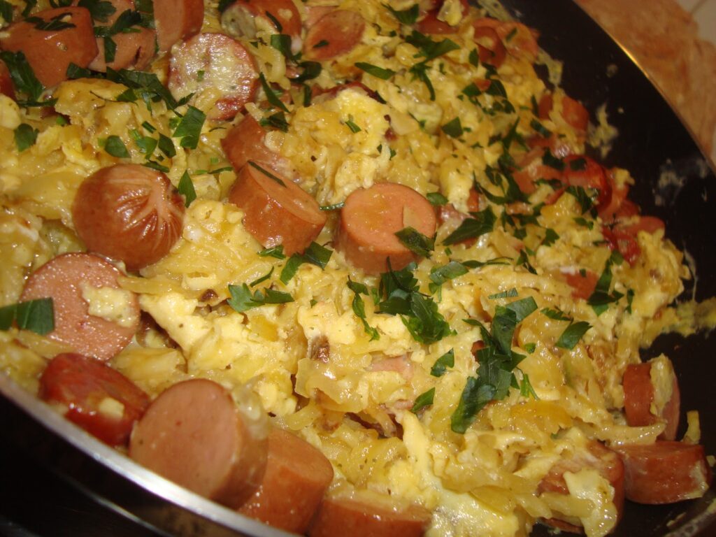 Escorra as batatas e junte-as ao preparado das salsichas, bem como os ovos batidos e temperados com um pouco de sal e pimenta.