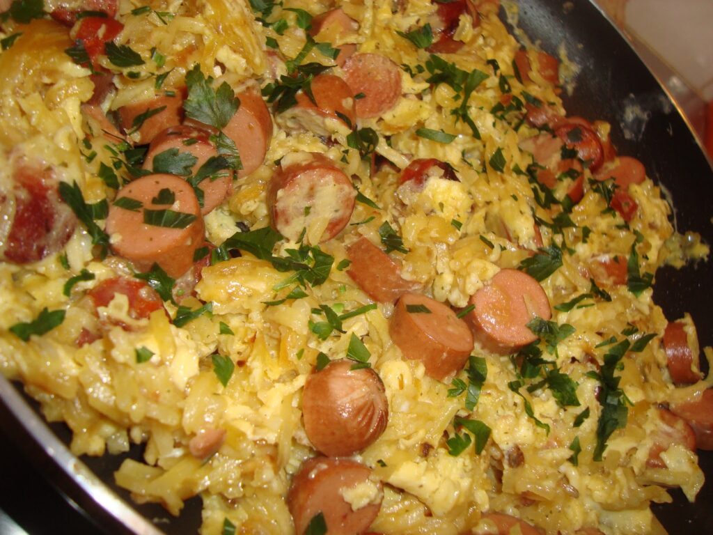 Escorra as batatas e junte-as ao preparado das salsichas, bem como os ovos batidos e temperados com um pouco de sal e pimenta.