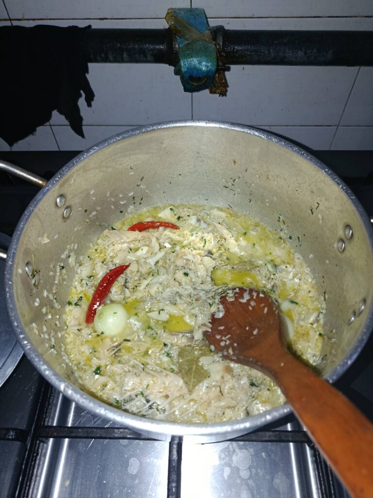 Junta o bacalhau desfiado e deixa saltear ligeiramente para ganhar sabor.