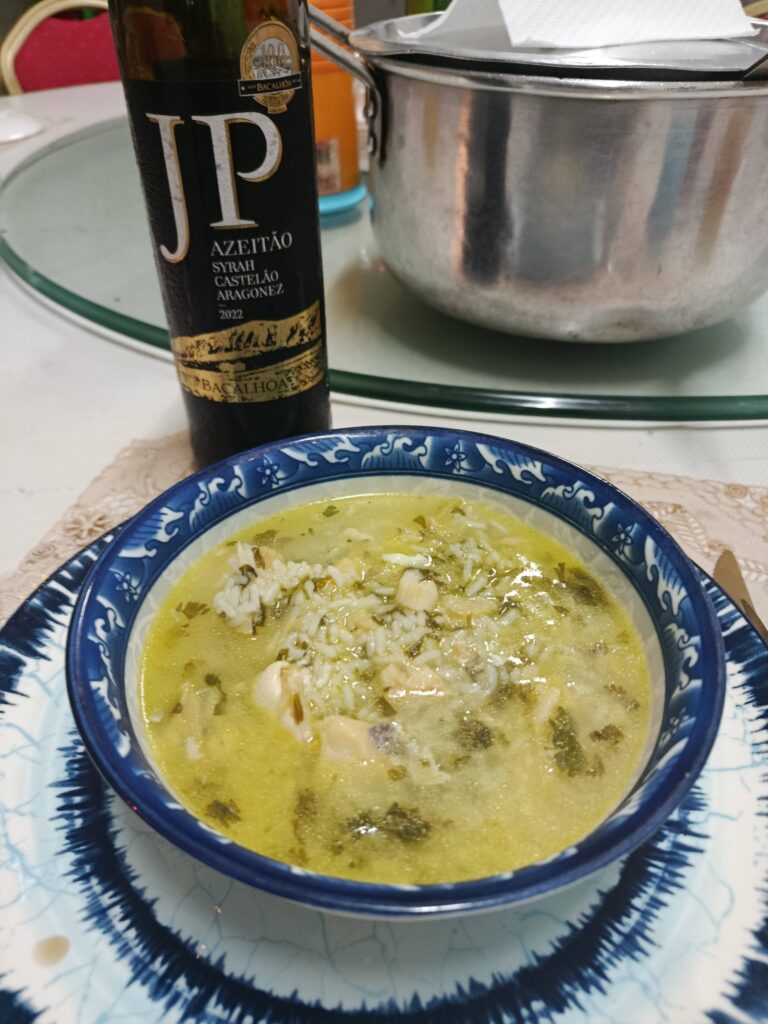 O arroz de bacalhau é um clássico das casas alentejanas: caldo quente, arroz solto, bacalhau desfiado e muito azeite.