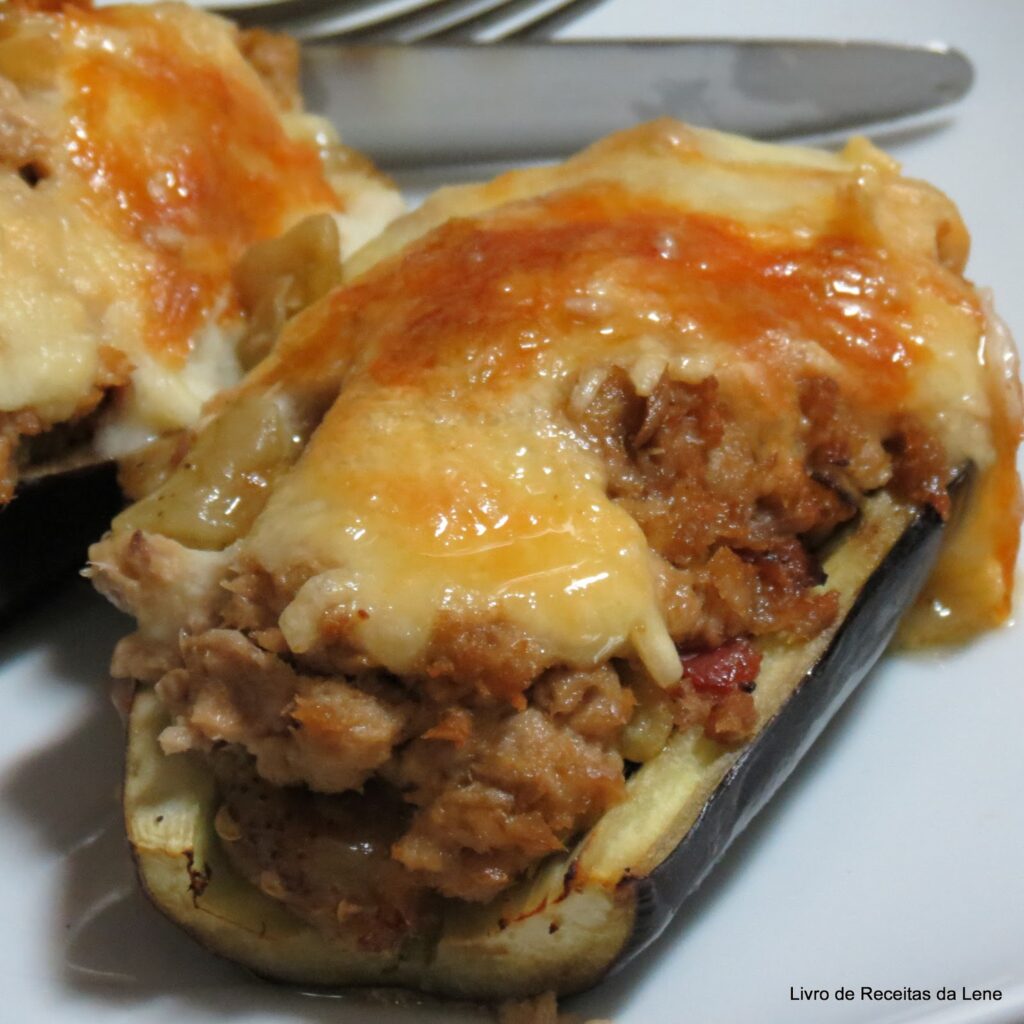 Neste caso, tinha atum que tinha sobrado, que utilizei para rechear a beringela.
