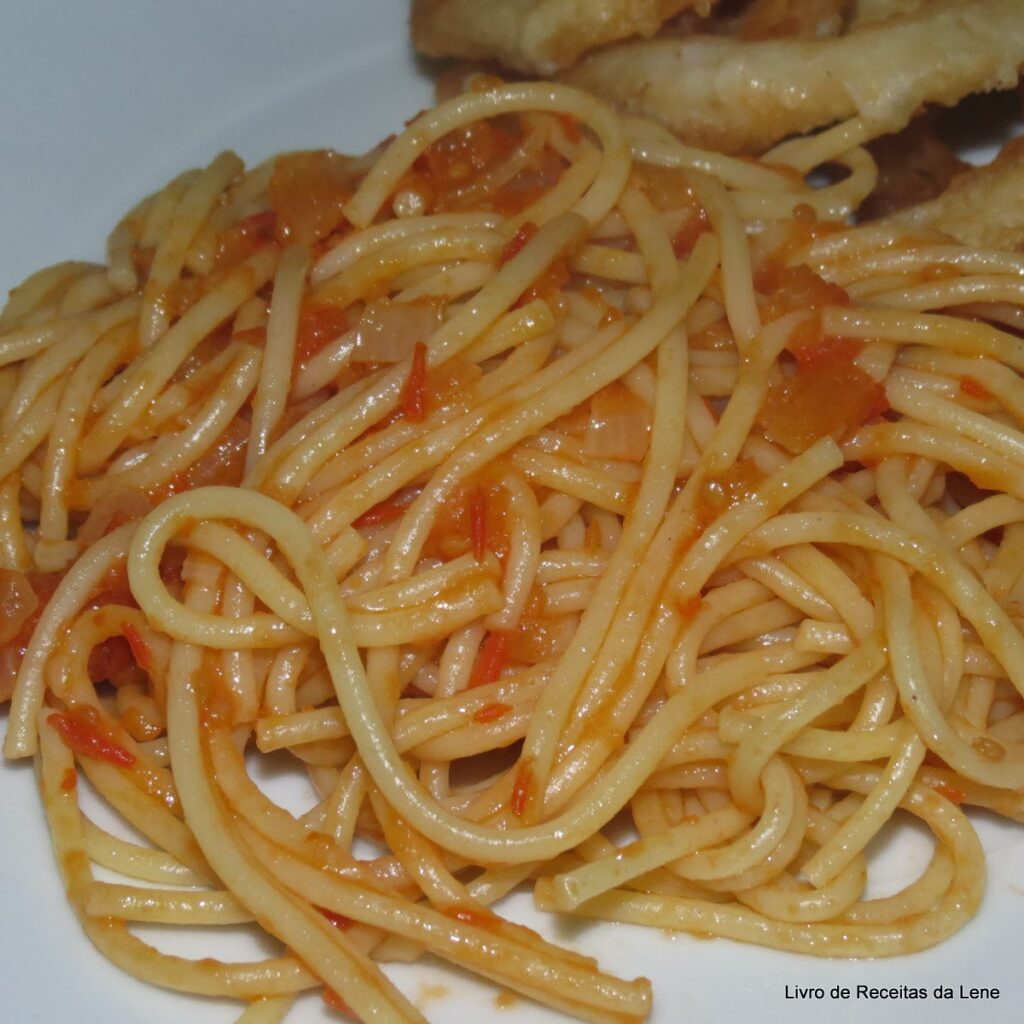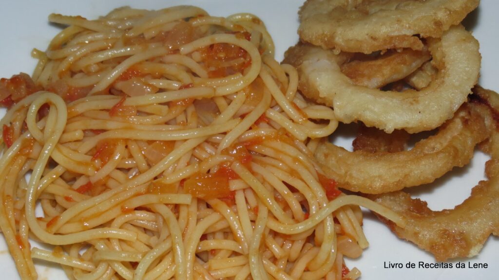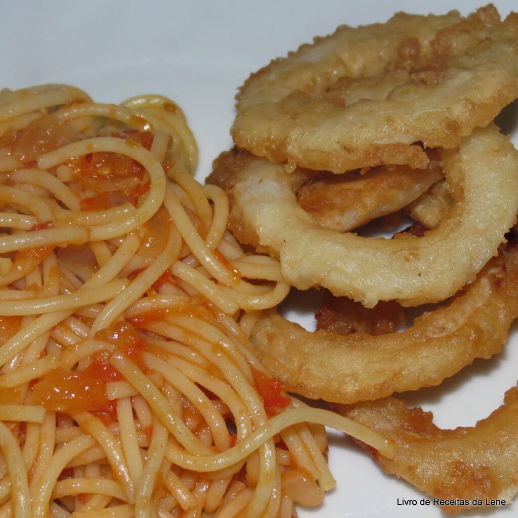 Acompanhei os calamares com esparguete salteada em estrugido de cebola e tomate ralado.