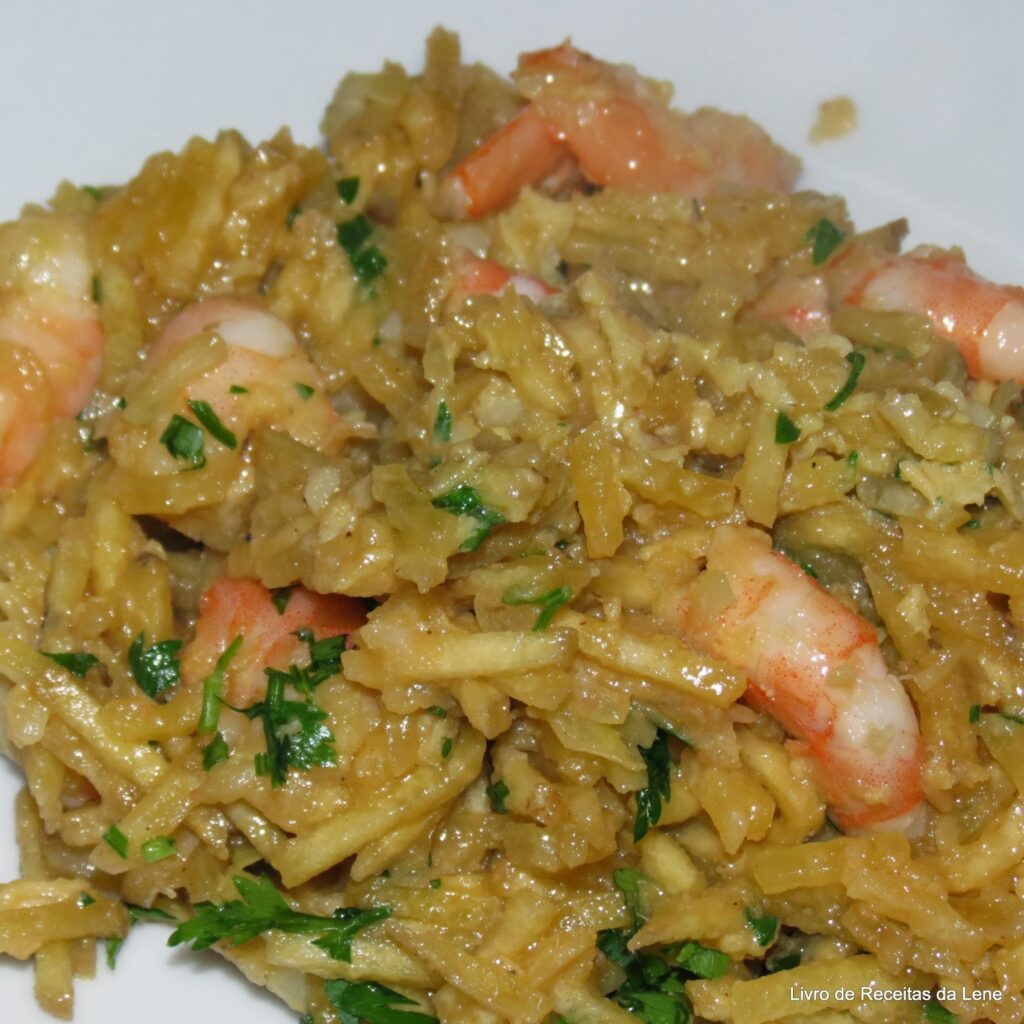 Quando estiver lourinho, adicione os camarões descascados para saltearem no azeite;