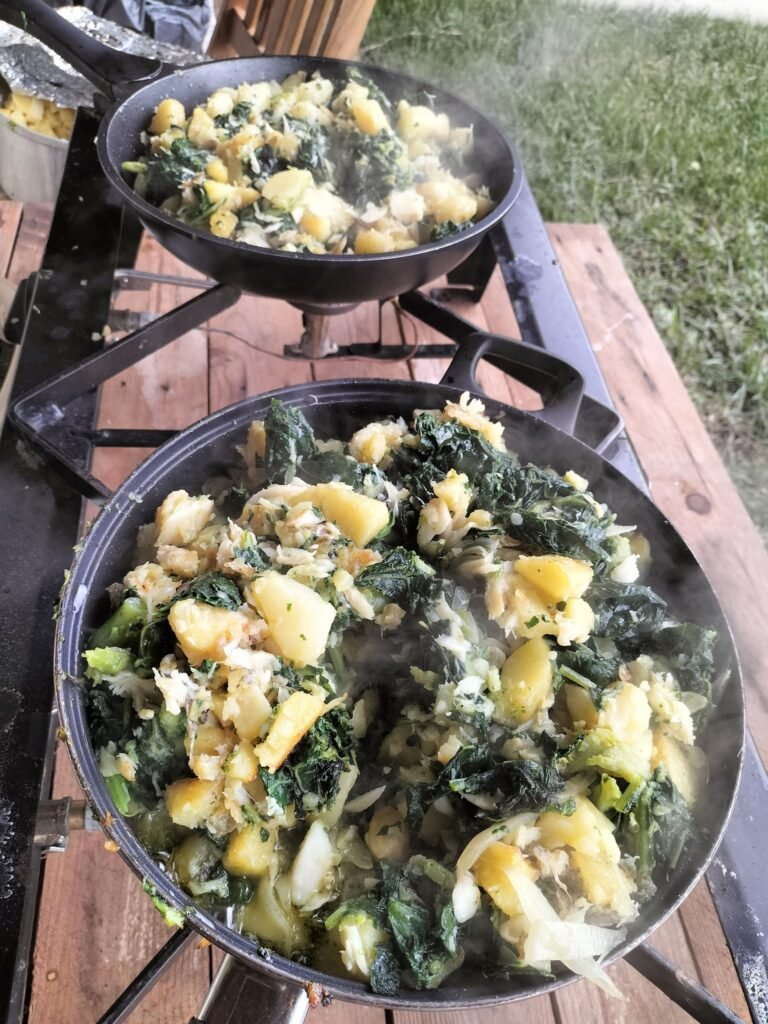 5️⃣ Entra o bacalhau, depois as couves, depois as batatas.