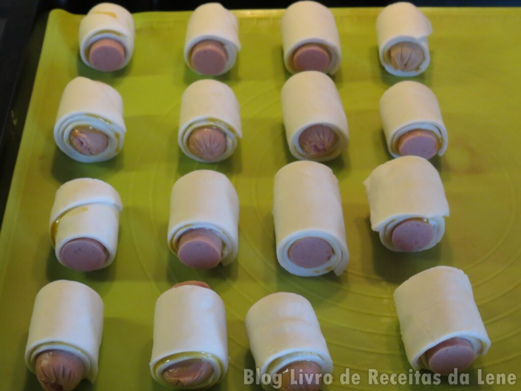Corte as salsichas a meio, e com enrole cada metade numa porção de massa folhada cortada;