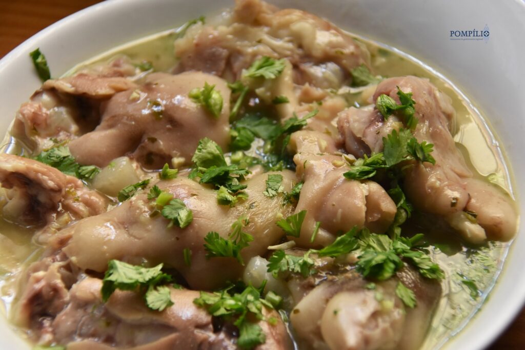 1️⃣ Coze os pezinhos em água com sal e louro até ficarem bem macios. Reserva o caldo.