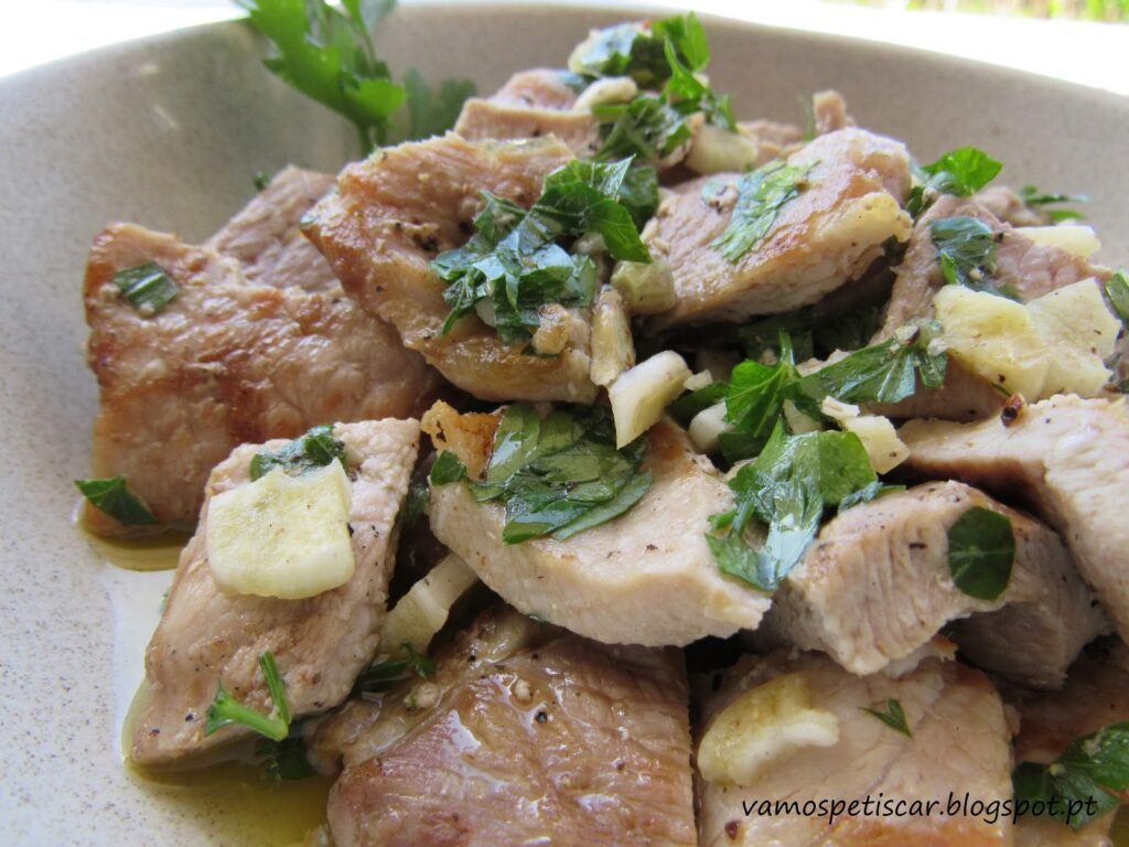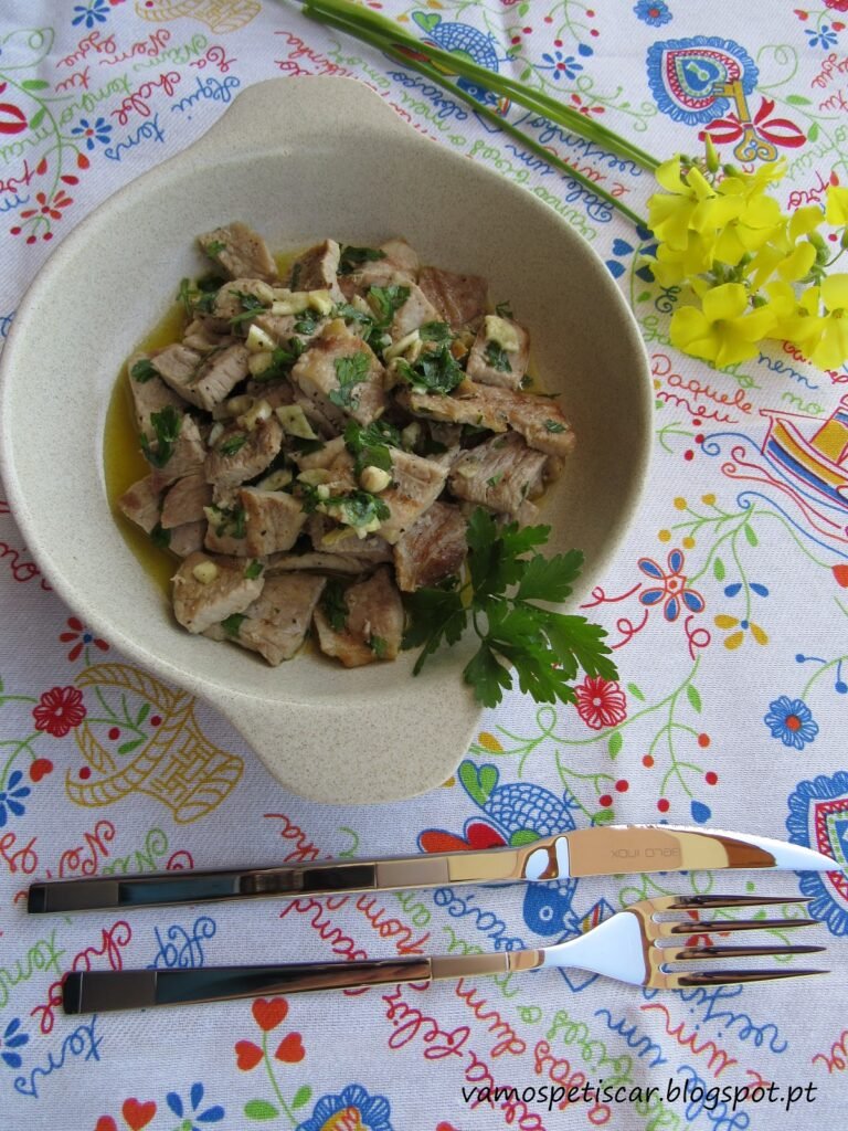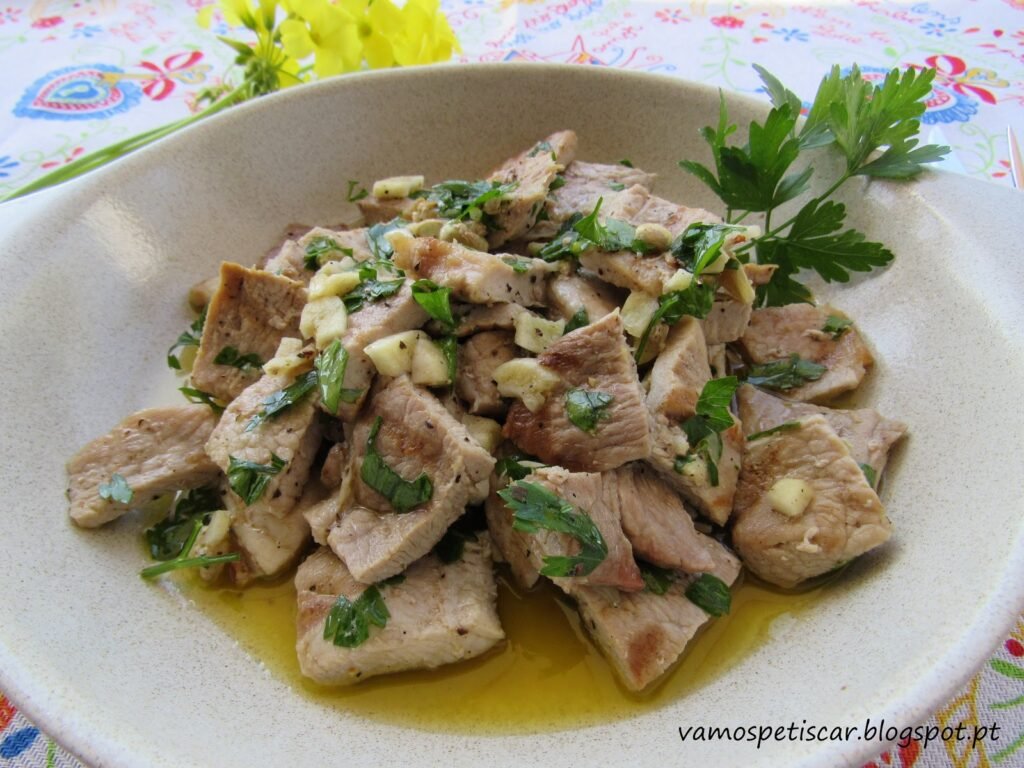 Temperar a carne com azeite, o sumo de limão,  os dentes de alho finamente picados, pimenta preta acabada de moer a gosto e a salsa picada. Misturar.