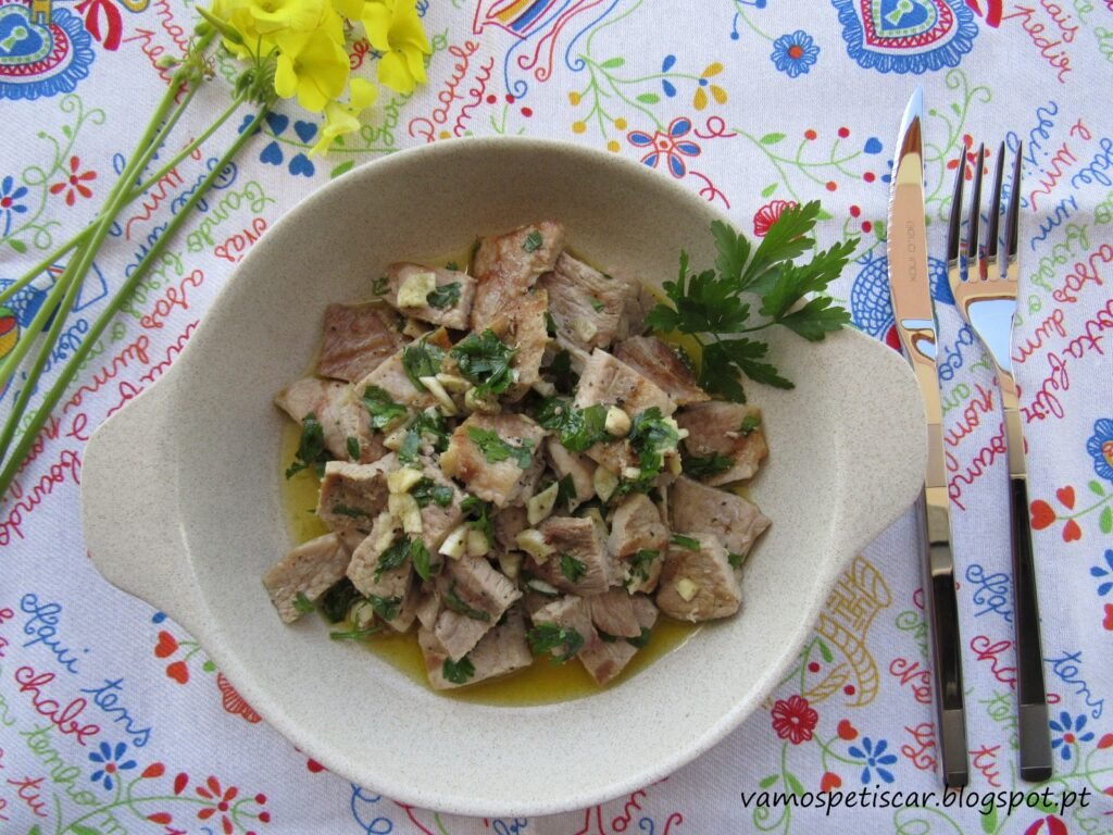 Temperar a carne com azeite, o sumo de limão,  os dentes de alho finamente picados, pimenta preta acabada de moer a gosto e a salsa picada. Misturar.