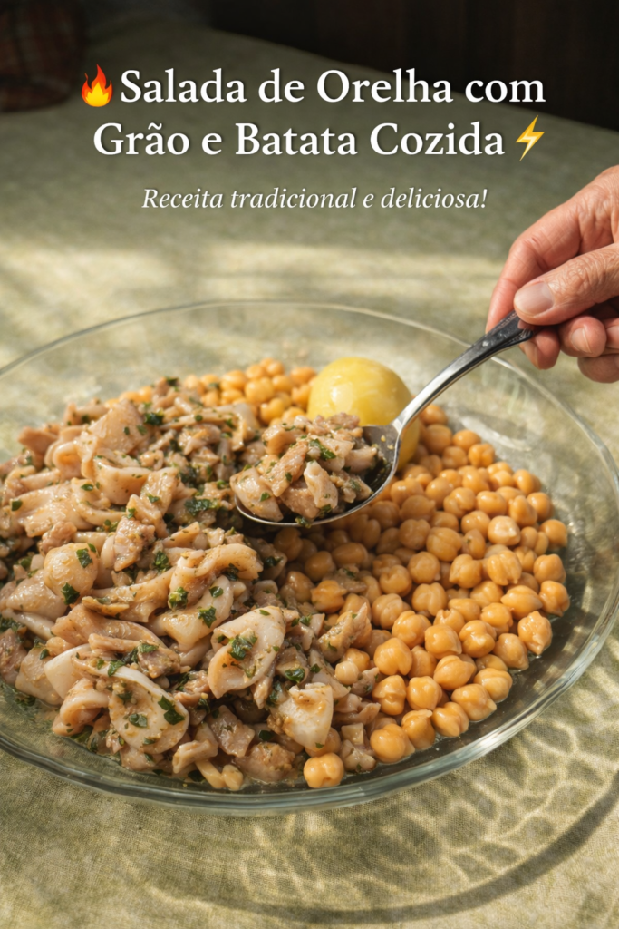A salada de orelha com grão e batata cozida é um prato tradicional português muito apreciado como petisco ou refeição leve. Rica em sabor e textura, combina a suavidade do grão com a intensidade da orelha de porco, temperada com azeite, alho e ervas frescas. Uma receita simples, económica e cheia de identidade.