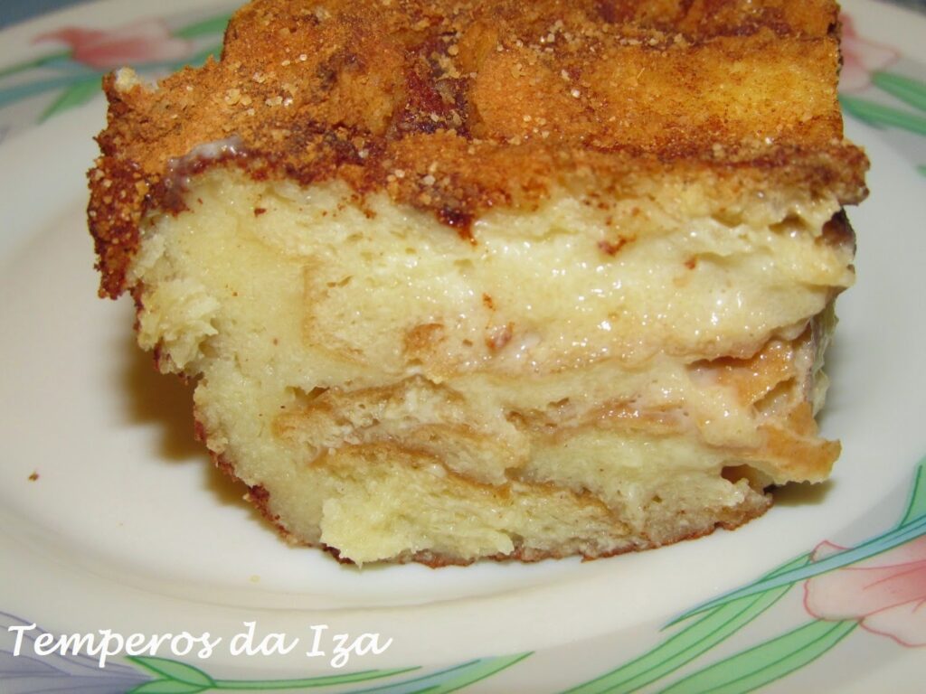 Corte os pães em pedaços e coloque-os no fundo da tarteira.