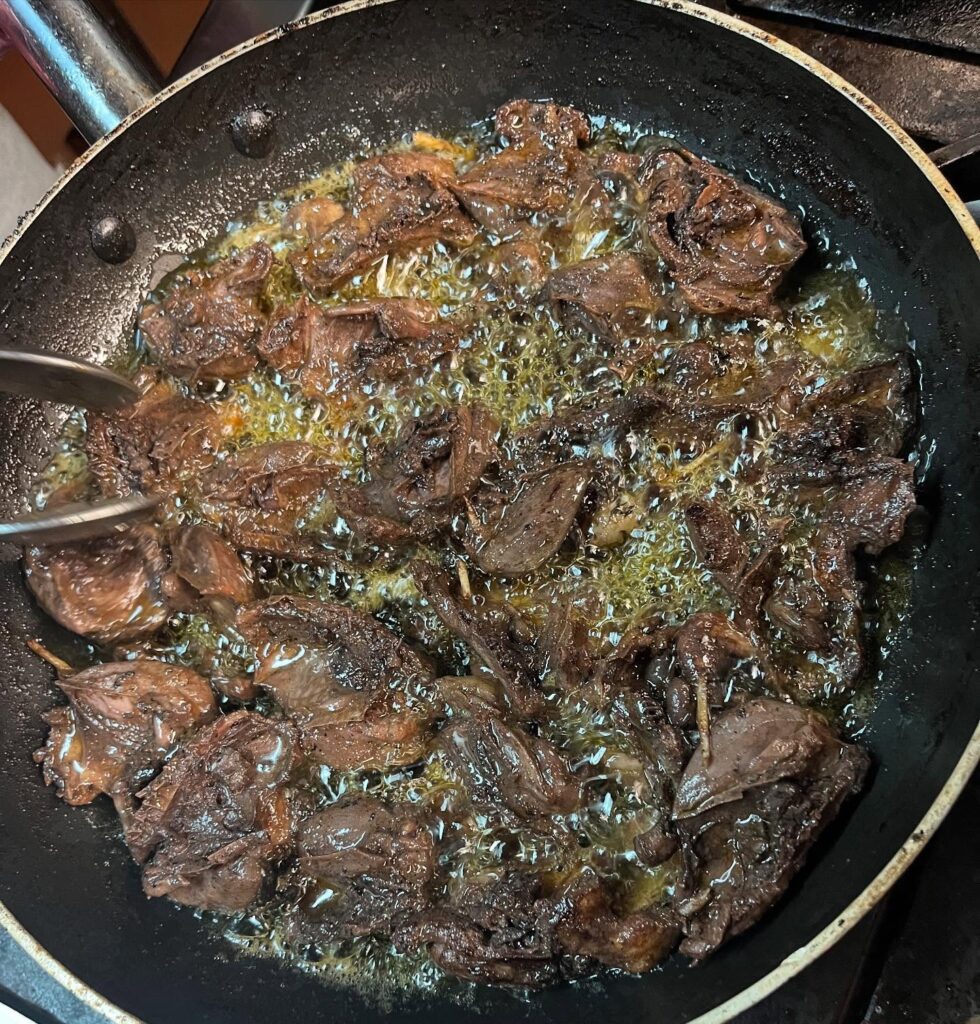A técnica é direta: fritura em gordura quente com bastante alho. O segredo não está na complexidade — está no tempo de fritura e no tempero correto. Quando bem feitos, os tordos ficam dourados, ligeiramente crocantes por fora e muito suculentos por dentro.